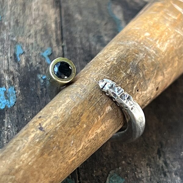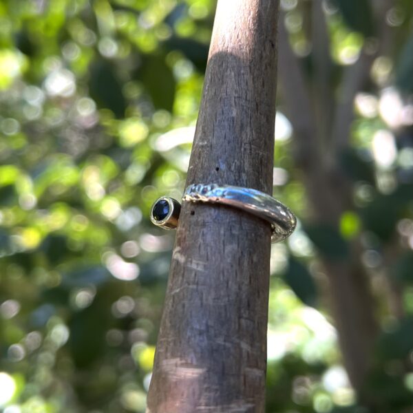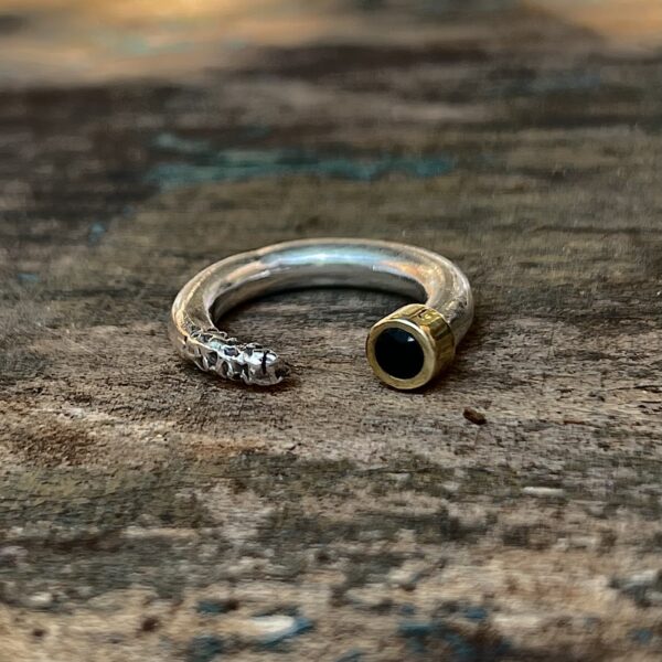An open ring with a spinel stone set in a brass tube. the ring itself is made of silver