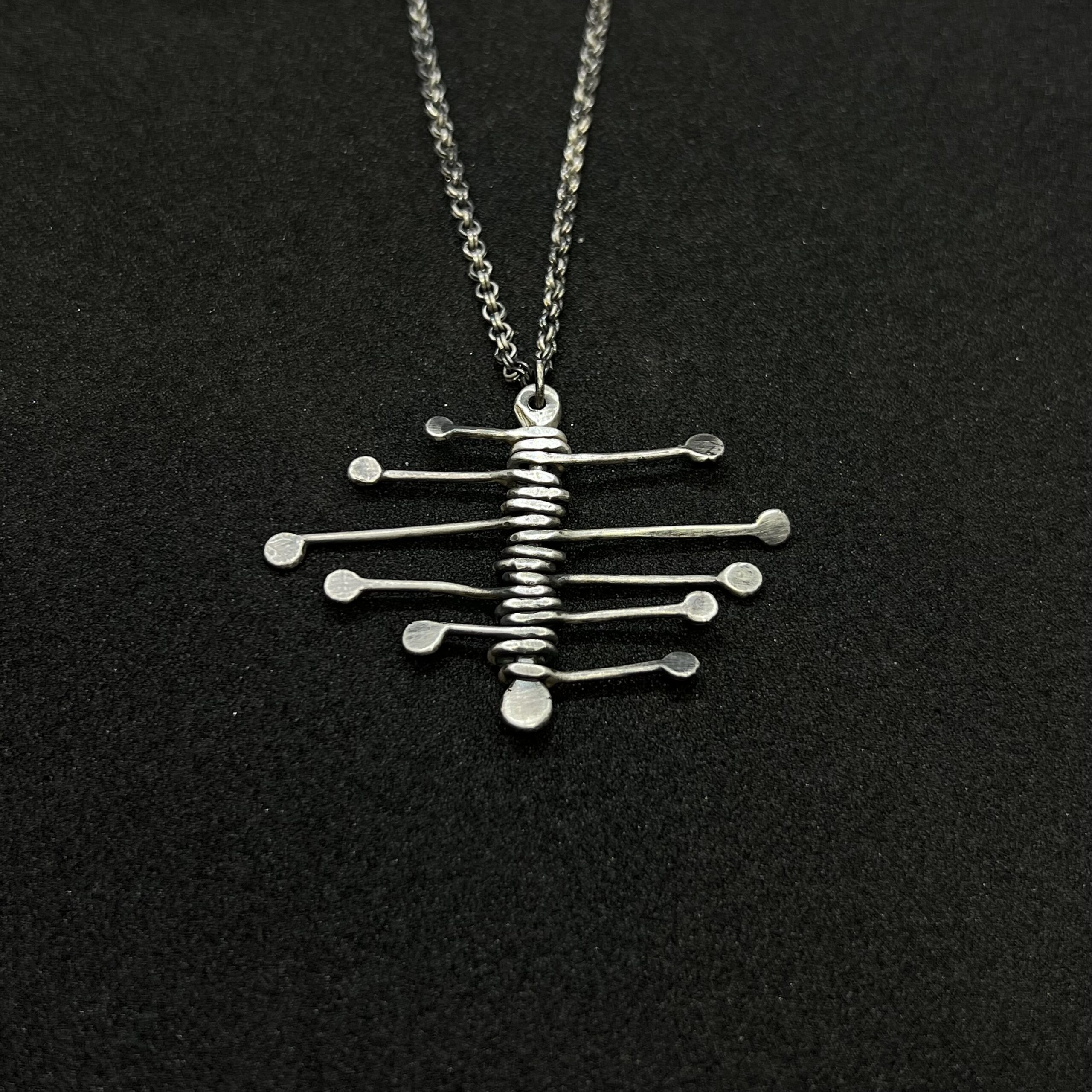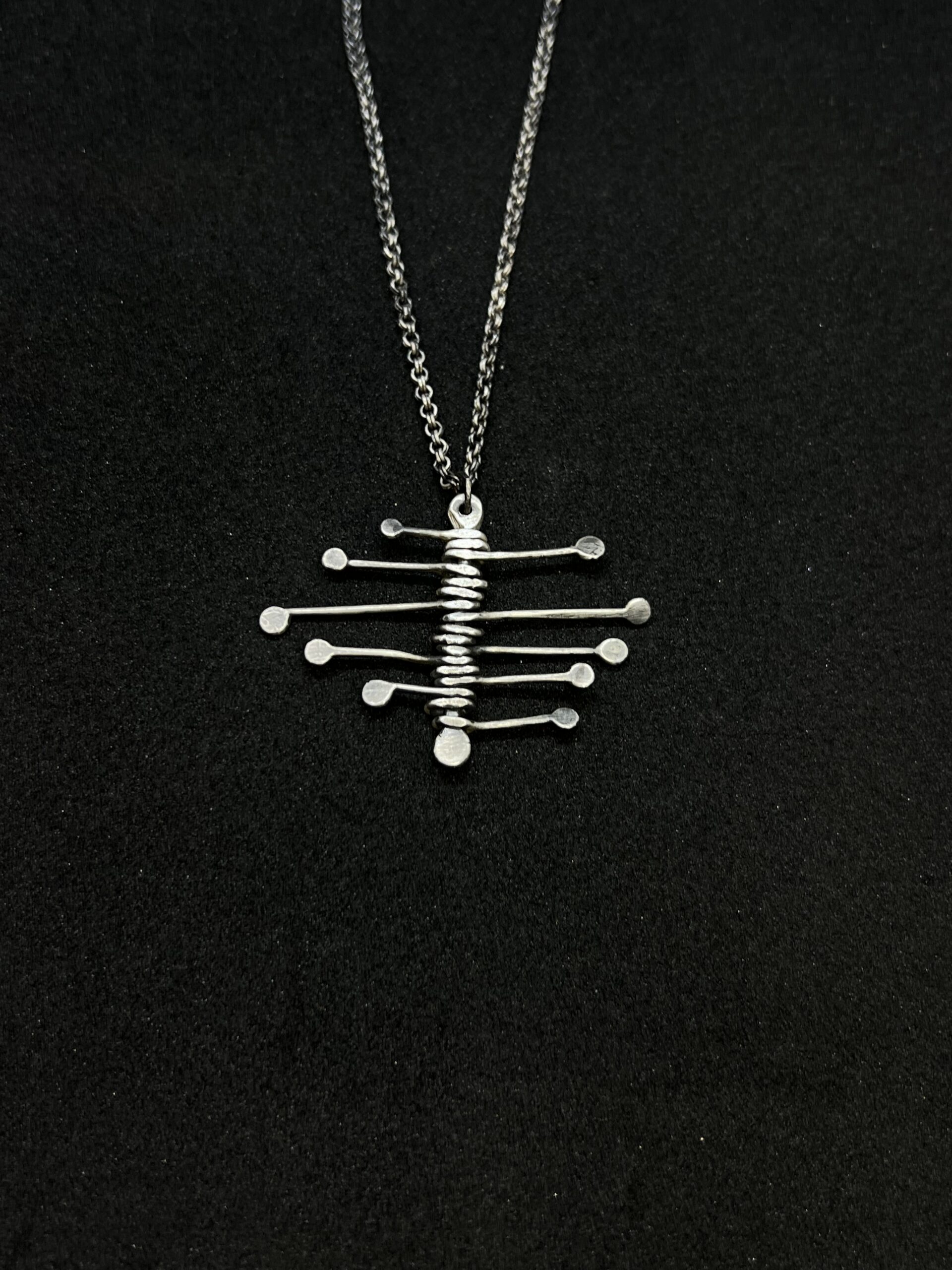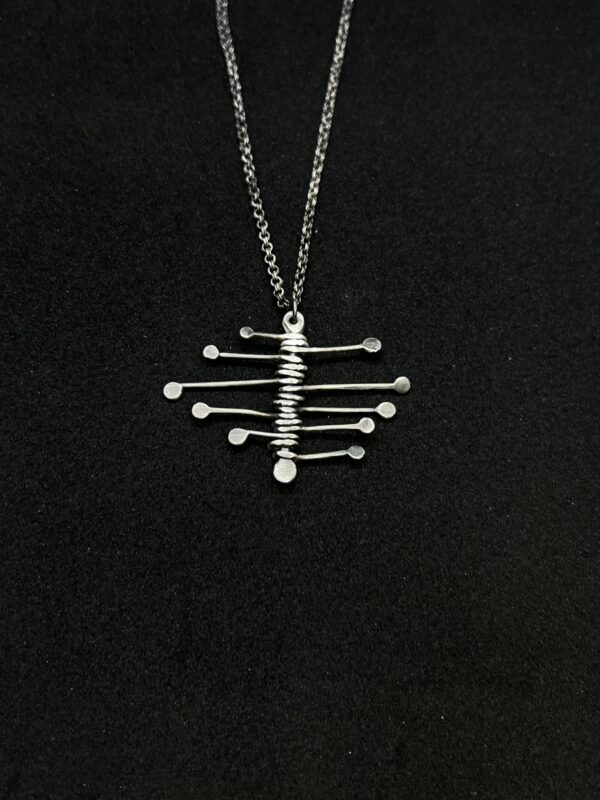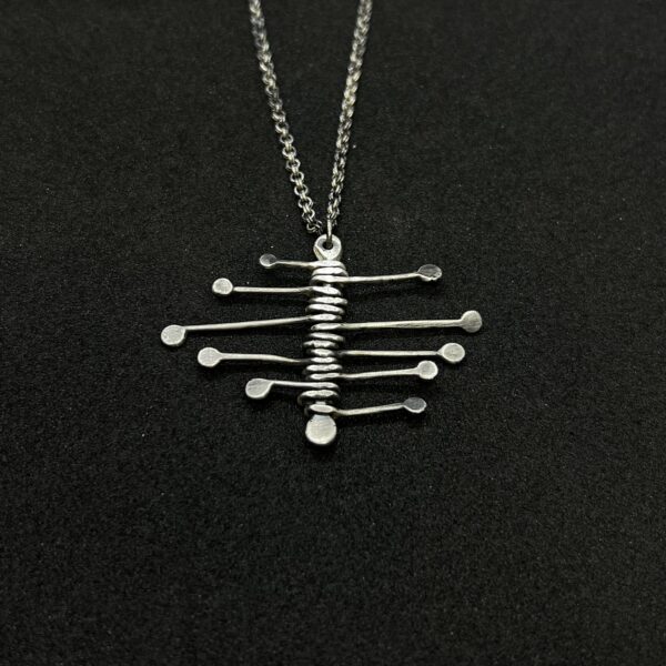 The necklace is made of silver rods with a circle at the end and each circle was hit and crushed into a flat circle.